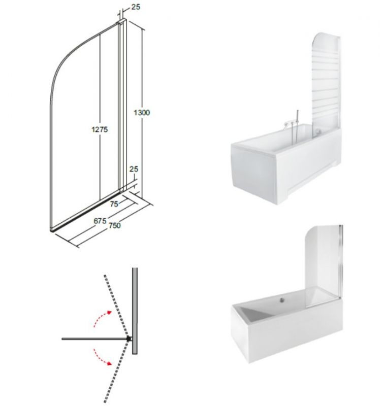 Käännettävä malli: oikea / vasen kokoonpano. Turvallinen karkaistu lasi ja alumiini, metallin yksityiskohtien kiiltävä kromipinta. Sopivat kylpyammeet: mikä tahansa suorakaiteen muotoinen kylpyamme, pituus 100 cm tai enemmän (kylpyamme ei sisälly suihkuseinän hintaan). Saatavana laaja valikoima yhteensopivia hana- ja suihkusarjasarjoja.