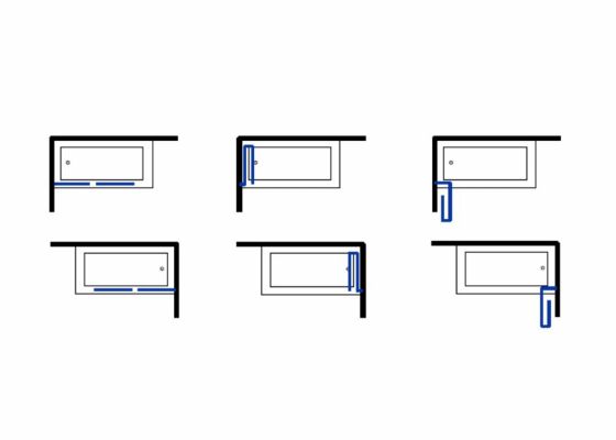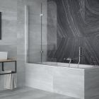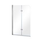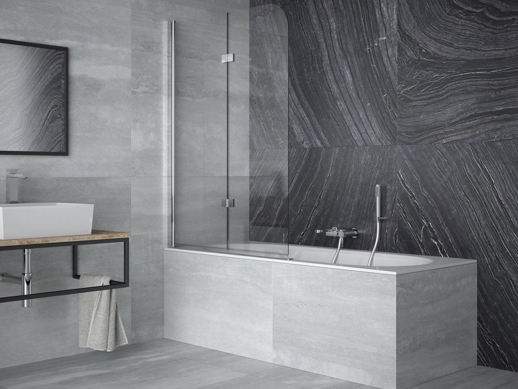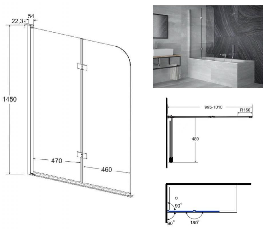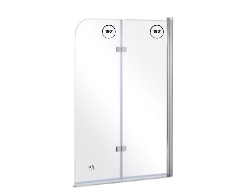 Käännettävä malli: oikea / vasen kokoonpano. Karkaistua lasia ja alumiinia, metallin yksityiskohtien kiiltävä kromipinta. Omatoimiset kylpyammeet: mikä tahansa suorakaiteen muotoinen kylpyamme, jonka pituus on 110 cm tai enemmän (kylpyamme ei sisälly suihkuseinän hintaan). Saatavana laaja valikoima yhteensopivia hana- ja suihkusarjasarjoja.
