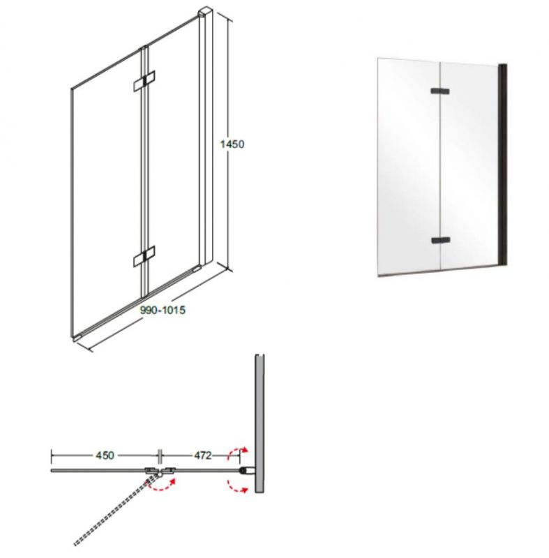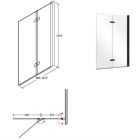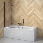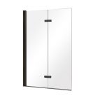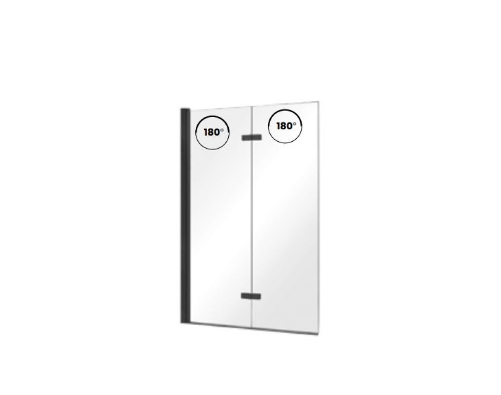 Käännettävä malli: oikea / vasen kokoonpano. Karkaistua turvalasia ja alumiinia, metallin yksityiskohdat mattamustaksi viimeistelty. Sopivat kylpyammeet: mikä tahansa suorakaiteen muotoinen kylpyamme, jonka pituus on 110 cm tai enemmän (kylpyamme ei sisälly suihkuseinän hintaan). Saatavana laaja valikoima yhteensopivia hana- ja suihkusarjasarjoja.