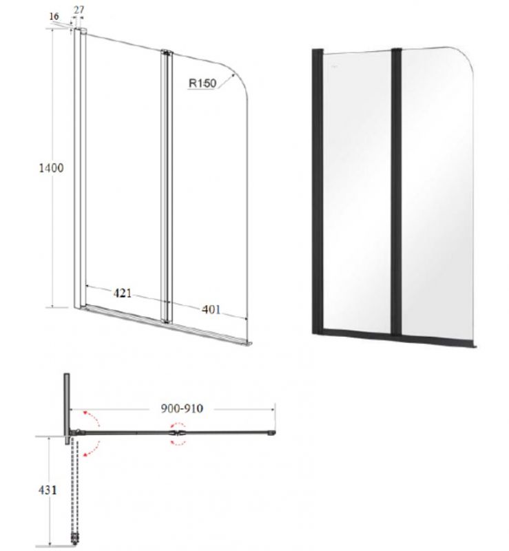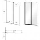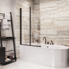 Käännettävä malli: oikea / vasen kokoonpano. Pohjan tiivistysprofiili. Karkaistua turvalasia ja alumiinia, metalliosien musta mattapintainen viimeistely. Sopivat kylpyammeet: mikä tahansa suorakaiteen muotoinen kylpyamme, pituus 100 cm tai enemmän (kylpyamme ei sisälly suihkuseinän hintaan). Saatavana laaja valikoima yhteensopivia hana- ja suihkusarjasarjoja.