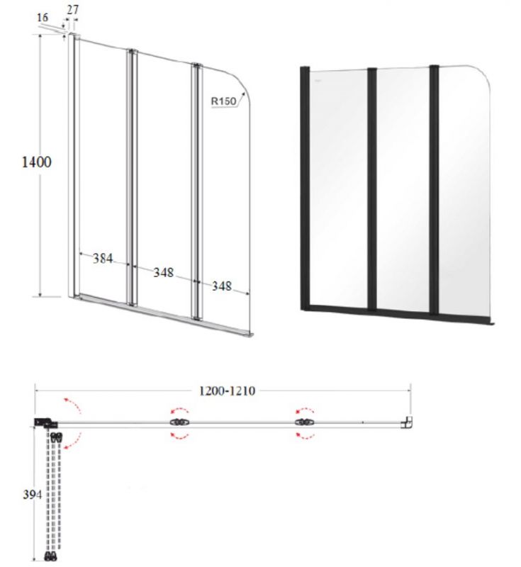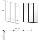 Käännettävä malli: oikea / vasen kokoonpano. Pohjan tiivistysprofiili. Karkaistua turvalasia ja alumiinia, metalliosien musta mattapintainen viimeistely. Sopivat kylpyammeet: mikä tahansa suorakaiteen muotoinen kylpyamme, pituus 100 cm tai enemmän (kylpyamme ei sisälly suihkuseinän hintaan). Saatavana laaja valikoima yhteensopivia hana- ja suihkusarjasarjoja.