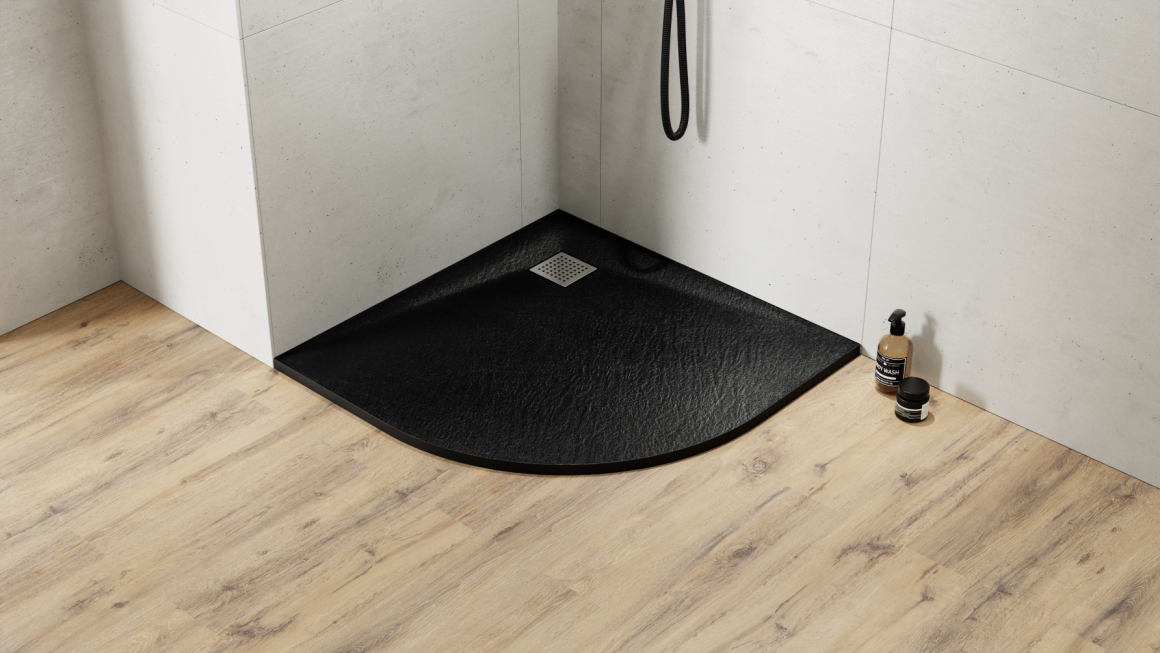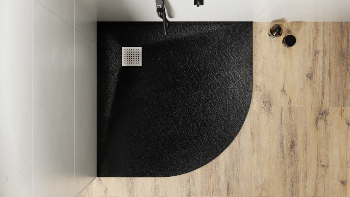 UltraSlim-suihkuallas, SMC, mattamusta pinta, jossa on luonnonkiveä jäljittelevä hienojakoinen rakenne. Suihkuastian hintaan sisältyy sarja yhteensopivaa viemärin suojusta ja sifonia, jossa on yläpuhdistustoiminto. Suihkualtaan muoto mahdollistaa joko lattialle tai lattiatasoon asennuksen, joka mahdollistaa kynnyksettömän sisäänkäynnin suihkutilaan. Suihkuallas voidaan leikata mittojen mukaan.