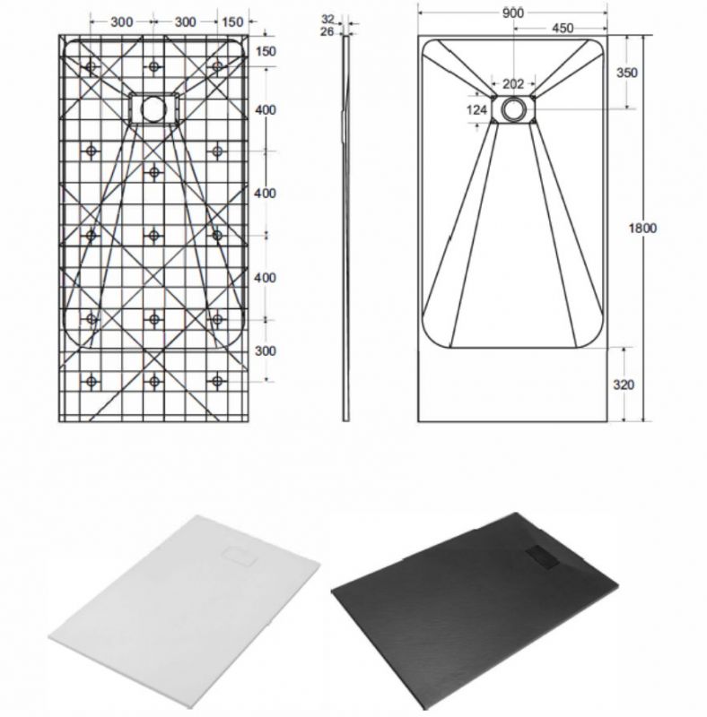 UltraSlim-suihkuallas, SMC, mattamusta pinta, jossa on luonnonkiveä jäljittelevä hienojakoinen rakenne. Suihkuastian hintaan sisältyy sarja yhteensopivaa viemärin suojusta ja sifonia, jossa on yläpuhdistustoiminto. Suihkualtaan muoto mahdollistaa joko lattialle tai lattiatasoon asennuksen, joka mahdollistaa kynnyksettömän sisäänkäynnin suihkutilaan. Suihkuallas voidaan leikata mittojen mukaan.
