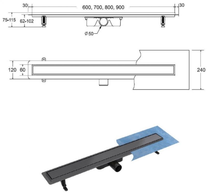 Lineaarinen suihkuviemärisarja on täydellinen ja asennusvalmis, ja se sisältää: viemäriputken, jossa on sifoni ja kiinnitysjalat, ritilä ja tiivistemansetti. Ohut ritilä, 6 cm leveä. Matala asennuskorkeus - alkaa 62 mm reunasta. 2-in-1 duo -tyyppinen ritilä, harjattu grafiittipinta tai asennettavaksi keraamisten laattojen kanssa. Ø 50 mm liitäntä (ilman pienennystä 40 mm:iin). Materiaali: ruostumaton teräs, ABS.
