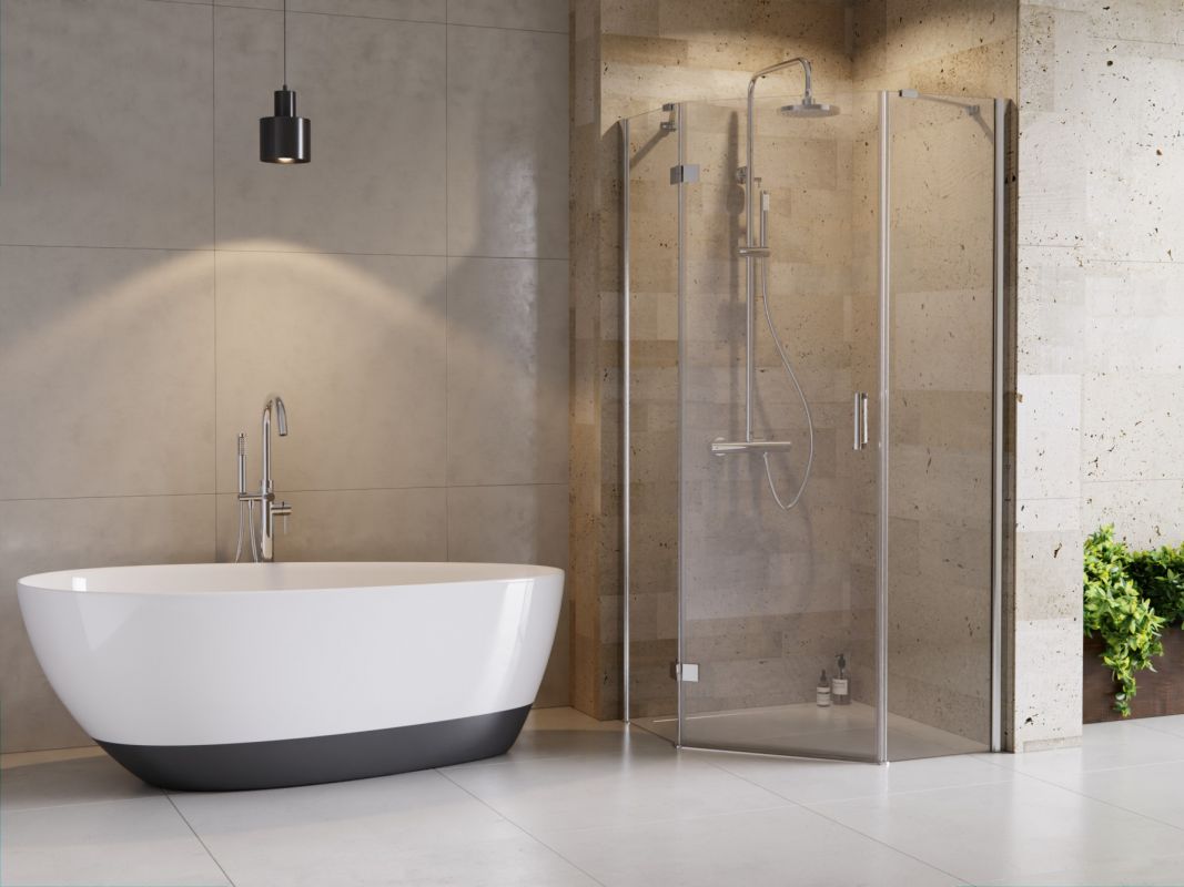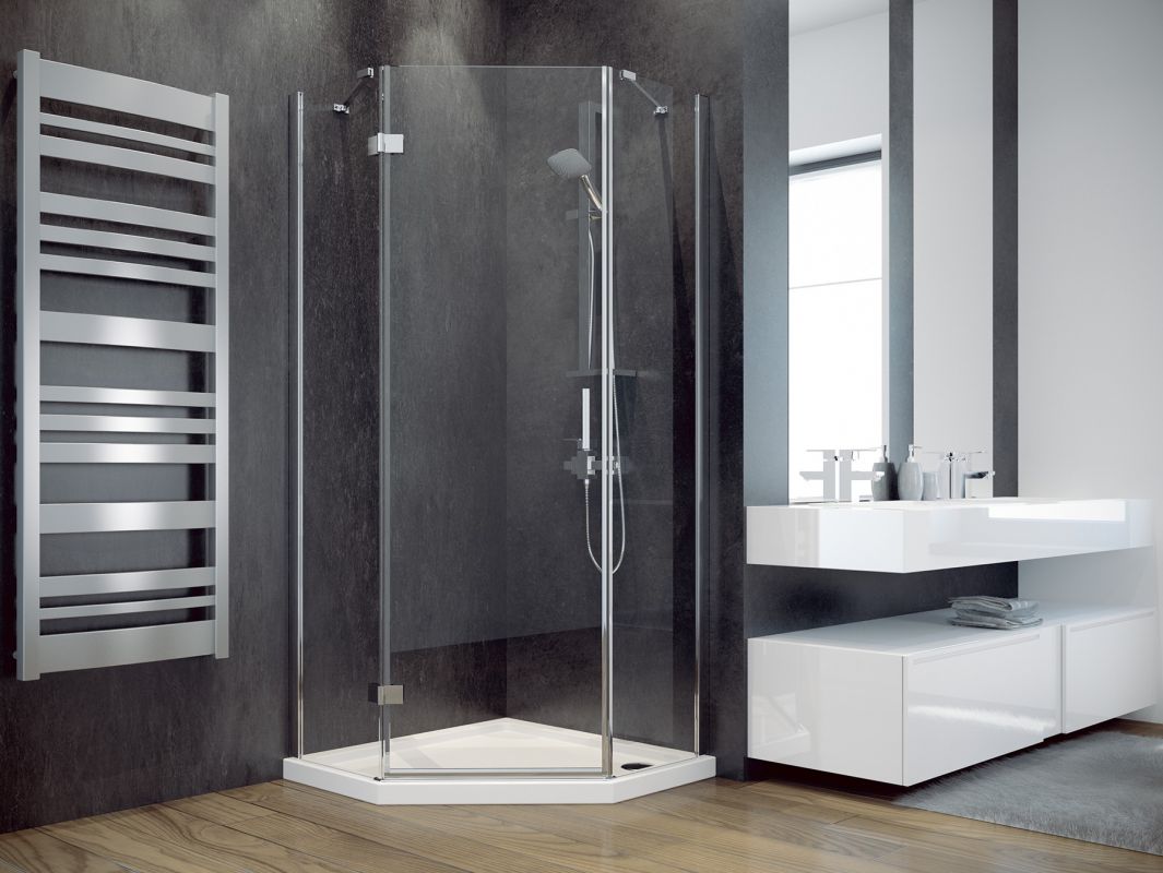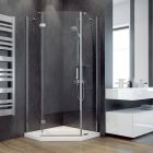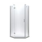 Viisikulmainen suihkukaappi. Ohjaamon oikea tai vasen puoli. 8 mm:n karkaistu kirkas turvalasi, profiiliton saranaovi, metalliosien kiiltävä kromiviimeistely. Magneettitiiviste ovessa. Alhaalla oven nostosaranat. Lamelli, joka valuttaa veden takaisin koteloon. Sopivat suihkualtaat: Bergo SlimLine Saatavilla on laaja valikoima yhteensopivia hana- ja suihkusarjasarjoja.