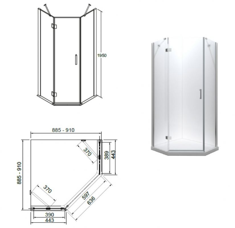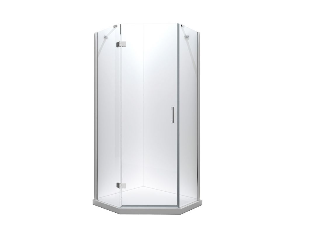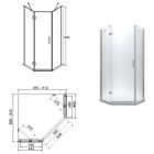 Viisikulmainen suihkukaappi. Ohjaamon oikea tai vasen puoli. 8 mm:n karkaistu kirkas turvalasi, profiiliton saranaovi, metalliosien kiiltävä kromiviimeistely. Magneettitiiviste ovessa. Alhaalla oven nostosaranat. Lamelli, joka valuttaa veden takaisin koteloon. Sopivat suihkualtaat: Bergo SlimLine Saatavilla on laaja valikoima yhteensopivia hana- ja suihkusarjasarjoja.
