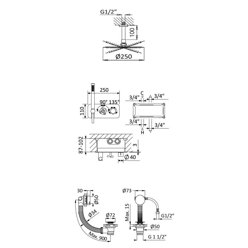 Bruma Genesi Termostaattinen amme- ja suihkusetti Ø250 mm yläsuihkulla, käsisuihkusetillä ja ammeentäytöllä, Auringonlasku Tuotekoodi: 191 512 1SS