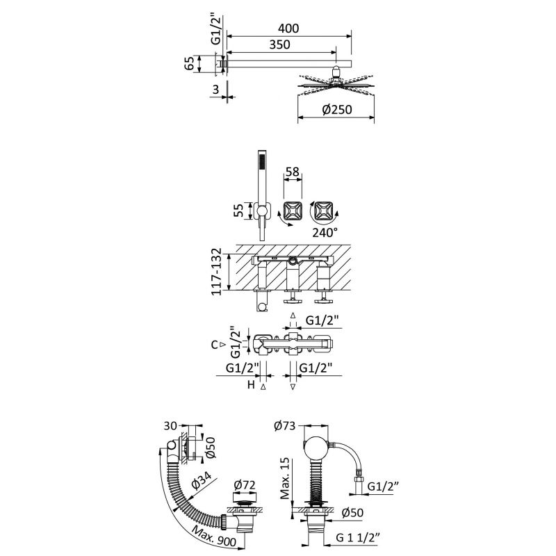 Bruma Navy Progressiivinen amme- ja suihkusetti Ø250 mm yläsuihkulla, käsisuihkulla ja kylpyammeen täyttöputkella, Puhdas valkoinen Tuotekoodi: 190 352 1PW