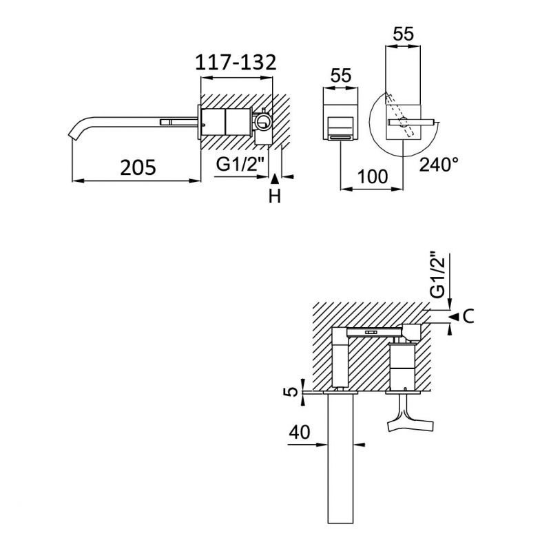 - 2-reikäinen, progressiivinen seinäasennettava pesuallashana;