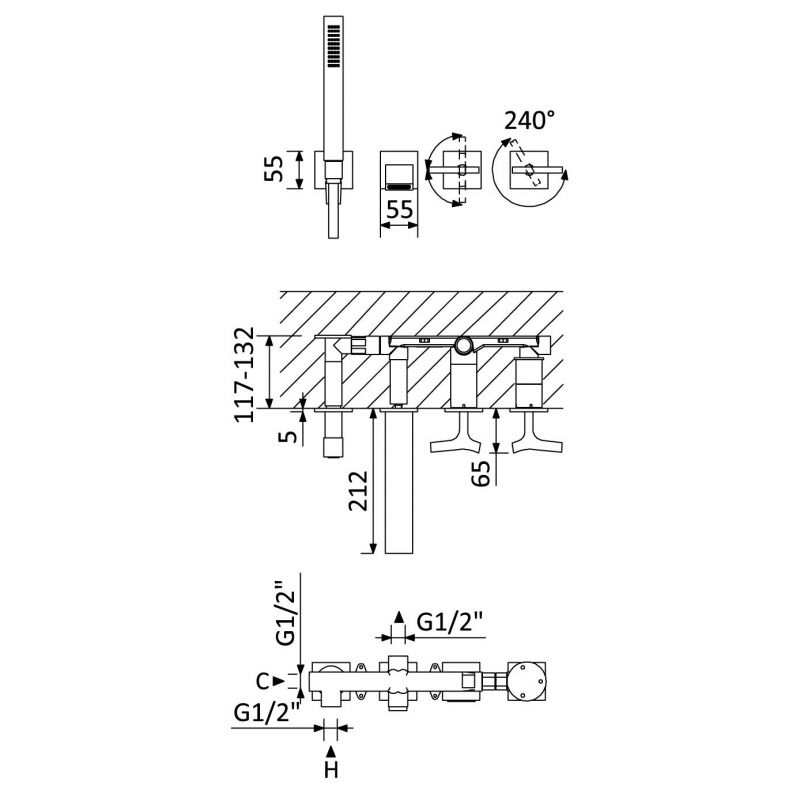 Bruma Royale Progressive-sarjan piilotettu 3-ulostuloiset sekoitin, jossa on EdgeQ-kylpyammeen suutin ja Quadra-käsisuihkusetti Auringonlasku Tuotekoodi: 192 193 1SS