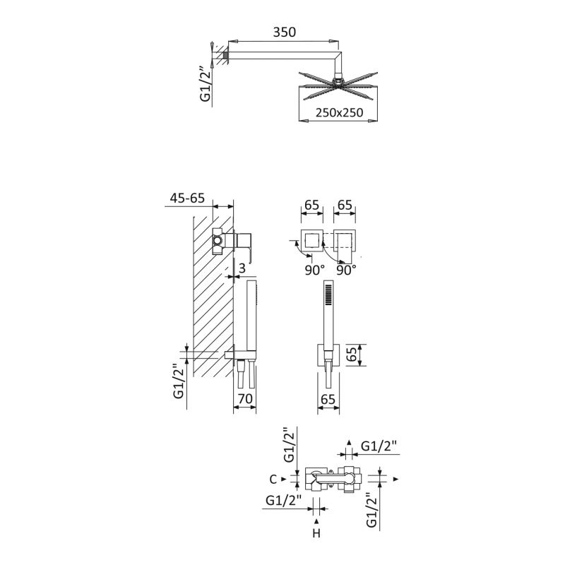 Concealed horizontal shower set, with Inox shower head 250x250 mm and separate handshower set Quadra Tuotekoodi: 182 750
