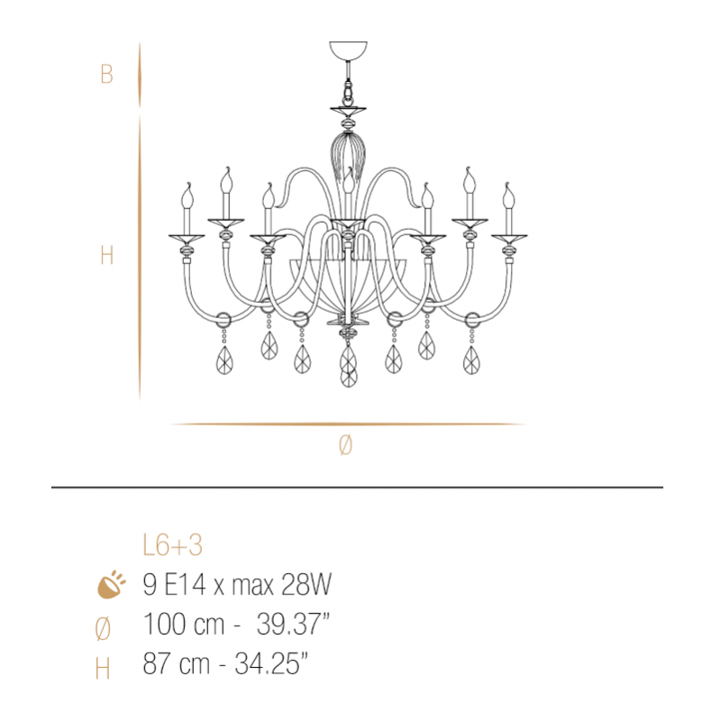 Toscanassa valmistettu keskirunko. Värillisellä reunalla varustettu lehti ja kristallikuppi on valmistettu Venetsiassa. Koristeltu Swarovski®-riipuksilla ja Swarovski®-kristallien kangasapplikaatiolla. Varjostin 34/62 mod. kartio pähkinänvärisellä pongè-kankaalla.