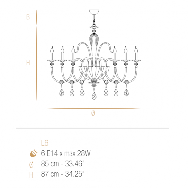 Toscanassa valmistettu keskirunko. Värillisellä reunalla varustettu lehti ja kristallikuppi on valmistettu Venetsiassa. Koristeltu Swarovski®-riipuksilla ja Swarovski®-kristallien kangasapplikaatiolla. Varjostin 34/62 mod. kartio pähkinänvärisellä pongè-kankaalla.