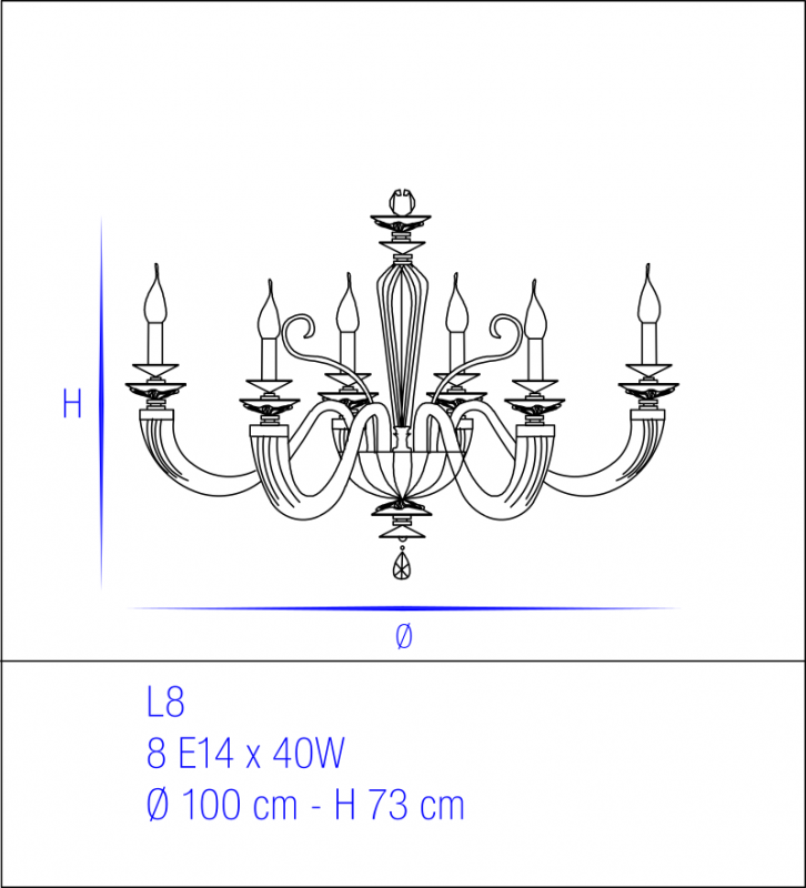 Toscanassa valmistettu fasettoitu keskirunko. Käsivarret, kuppi ja kiharat valmistettu Venetsiassa. Koristeltu Swarovski®-kristalleilla.