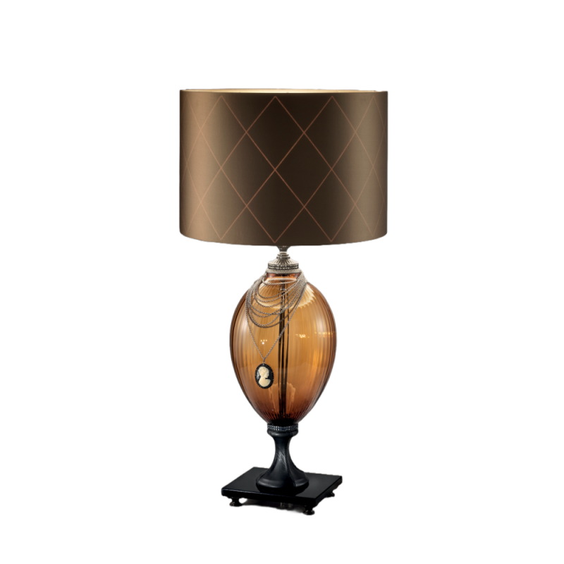Toscanassa valmistettu keskirunko. Aidolla nahalla päällystetty elementti. Marmorinen pohja. Sovellukset mustilla kivillä. Käsintehty kaulakoru, 24 karaatin kullattu tai antiikkihopea cameolla. Lampunvarjostin 70/69 kultaa, mod. Sylinteri monaco / pvc-kangas kullanvärisenä ja timanttijyrsinnällä. Rikastettu riipuksella Swarovski®.