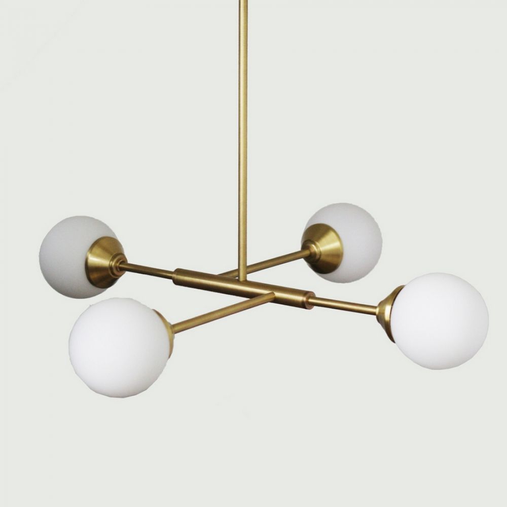 Messinkiputkista ja virheettömästä valkoisesta maitolasista valmistettu lamppu. Pieni koko mahdollistaa tämän valaisimen käytön uusissa rakennuksissa, joissa kattokorkeus on alhainen. Valo on suunnattu neljään suuntaan, joten voit valaista suuren alueen. Tämä valaisin täydentää ihanteellisesti modernia jugendtyyliä, olohuonetta ja makuuhuonetta. Messinki sopii täydellisesti eri huonekalujen värien kanssa