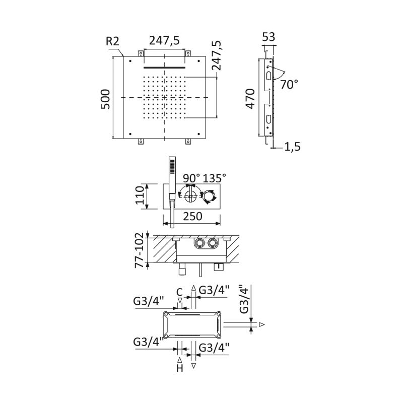 Thermostatic concealed shower set with overhead shower (Rain/ Cascade) and handshower set Tuotekoodi: 192 788